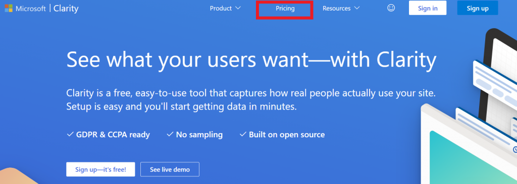 In our redesign, we gave pricing its own page and placed the link in the header. This really allowed us to showcase that Clarity is free and always will be whilst also allowing us to explain why it is a free product. Furthermore, it added an extra element of delight when new users join and realize they can get so many insights about their users and website for zero cost!