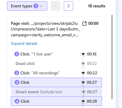 To use it, click More Details on a recording to open the event timeline. You’ll see a breakdown of all actions and events across the session—like clicks, scrolls, and Smart Events. With the new filtering option, you can: