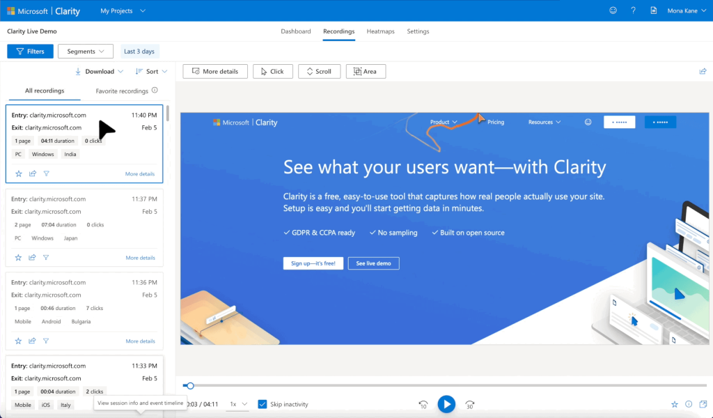 For ecommerce online sellers, Clarity is a no-brainer as it offers powerful data and insights into customer behavior. You’ll quickly be able to view Heat Maps and Click Maps which show what users want and how you can play around with design to get more attention from them on specific items. With Clarity installed on your ecommerce site you’ll be able to: