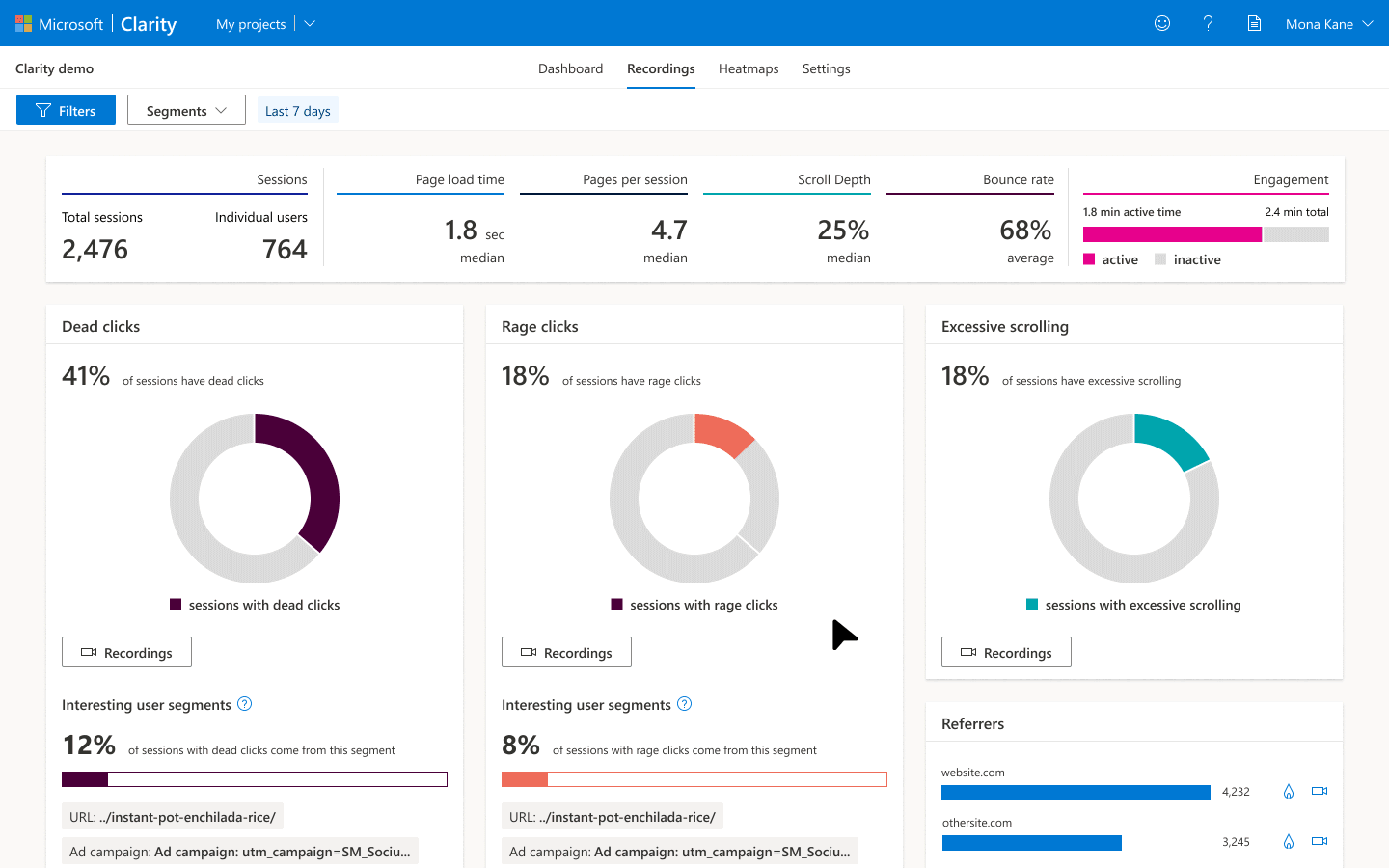 With Interesting user segments, our Clarity insights go beyond our standard behavioral metrics and give you the top segments that contributed to it.